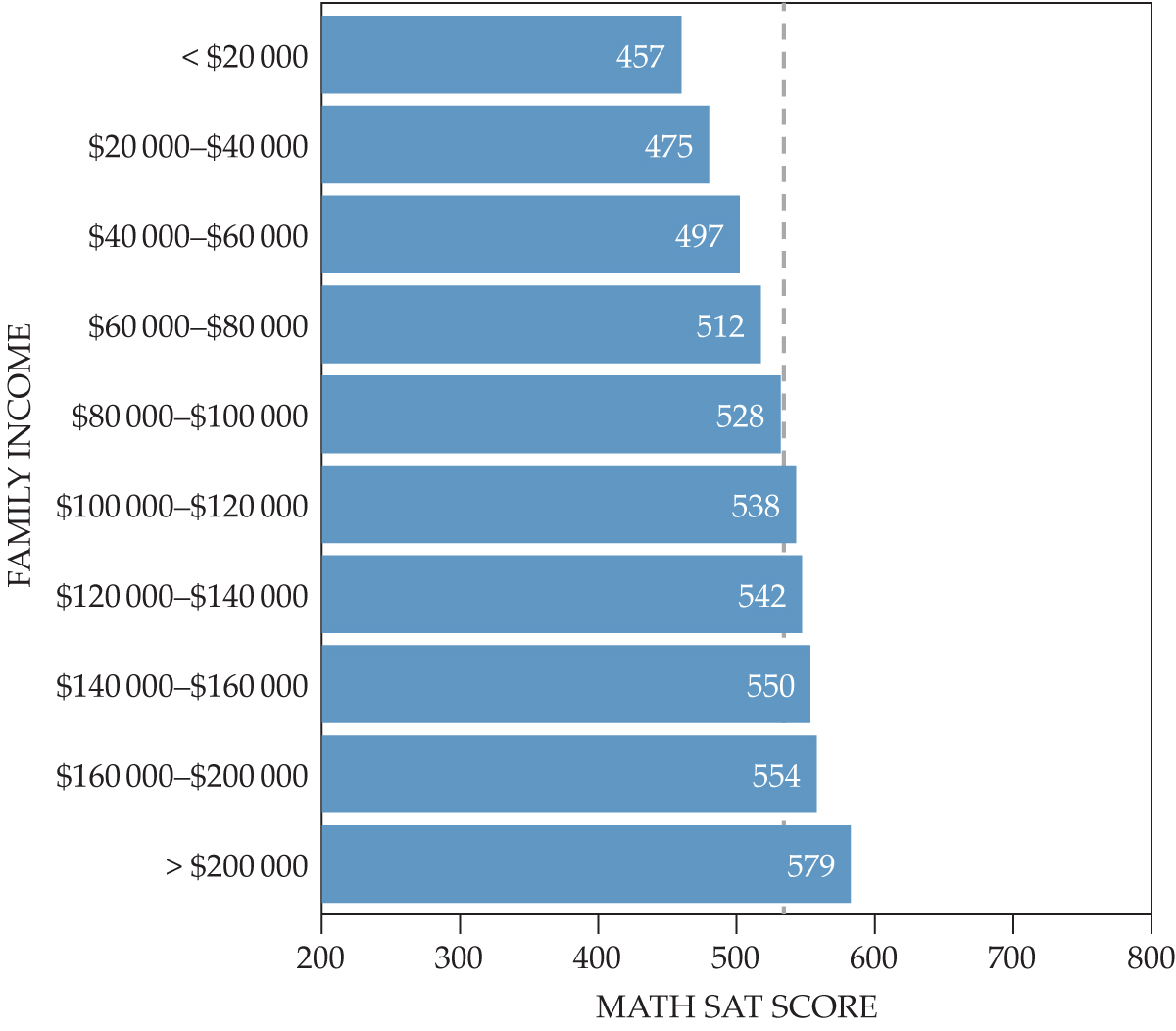 Average math SAT scores of student test takers in 2009 are correlated with family income. The College Board suggests that a score of 530 indicates college readiness, but students from households with an income under $100 000 often score below that benchmark on average and require remedial coursework. (Chart adapted from ref. 8.)