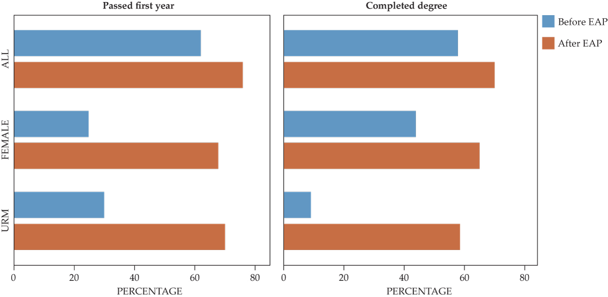 The program has broadened access to STEM degrees for students from diverse educational backgrounds. Figure 5 illustrates how the EAP is meeting its objectives. Degree completion for all students is boosted by the gains among women and those from historically underrepresented groups in STEM. Compared with the two years before the EAP’s implementation, the number of underrepresented minority students who complete STEM degrees in six years has increased by about 50%.