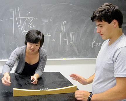 Figure 2. The Gauss gun is a simple device that converts magnetic potential energy to kinetic energy. In a laboratory demonstration, a student lets a metal ball roll toward a magnet (leftmost of the four spheres in the photo). As the rolling ball nears the magnet, it experiences a sudden strong attraction; once it strikes the magnet, the weakly bound rightmost ball shoots off the assembly with surprising speed; a short video at https://www.youtube.com/watch?v=fiSd91sLtS4 shows the gun in action. In the Project NEXUS laboratory at the University of Maryland, the Gauss gun serves as a model for exothermic reactions, as part of a thread that culminates in students understanding the hydrolysis of adenosine triphosphate—the prime source of chemical energy in cells. To literally get a feel for the strong and weak chemical bonds involved in the hydrolysis, students manipulate metal spheres touching the magnet.