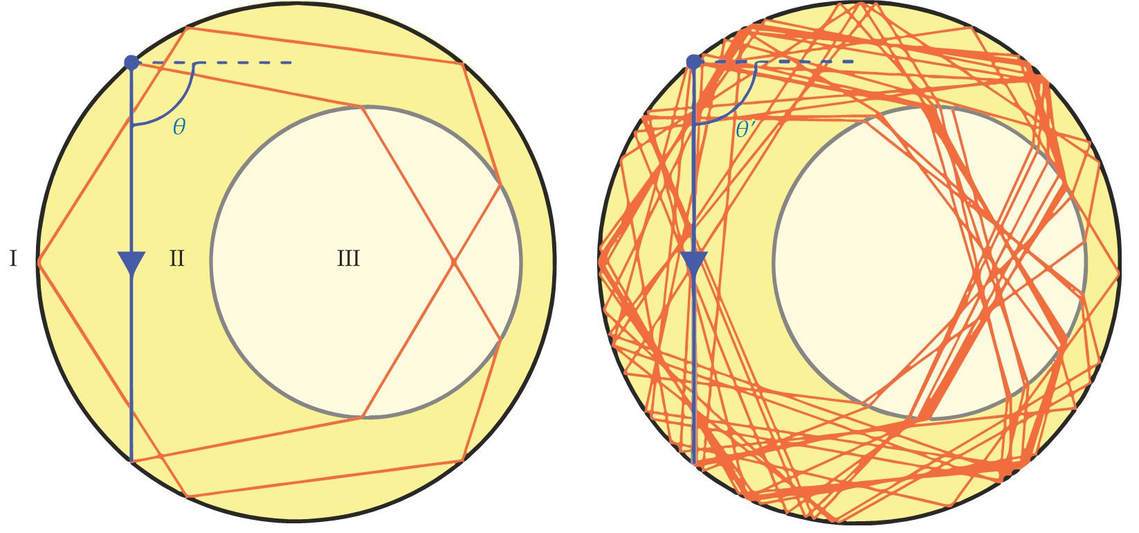 Light trapped in this cavity displays chaotic behavior. In this dielectric medium the index of refraction is largest in the smallest circle (region III), smaller in the region between the two circles (region II), and smallest in the surrounding area (region I). Two ray trajectories (blue arrows) differ only slightly in their initial angles,