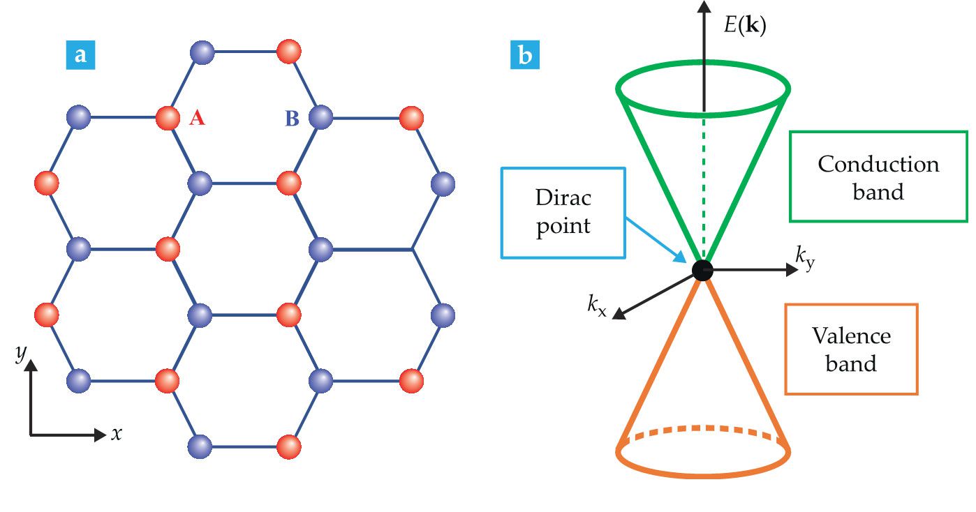 Graphene’s lattice determines the energy band structure. (a) The two-dimensional honeycomb lattice comprises two nonequivalent triangular sublattices, A (red) and B (blue), of carbon atoms. (b) That structure determines the relation between an electron’s energy