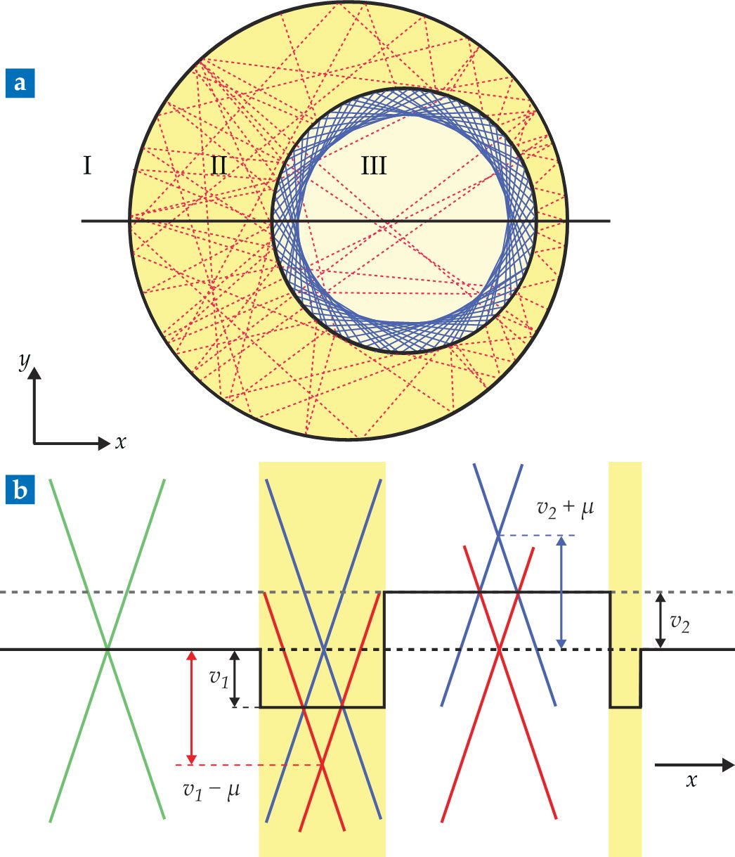 How then can an external electric potential confine quasiparticles? Classical chaos can make the task even harder. Because chaos leads to ever-changing trajectories, confined light will frequently hit a barrier at an angle that exceeds the maximum for total internal reflection, and it will escape its confines. According to the ray–wave correspondence, which is fundamental to quantum chaos, quantum particles will behave the same, and long-lived trapping is unlikely. But massless pseudospin-1 quasiparticles defy that intuitive picture. 12 They can be localized through the mechanism of revival Klein scattering resonances, which is analogous to exciting localized surface plasmons at a metal–dielectric interface. The counterintuitive emergence of resonant states of the quasiparticle represents a twist on the Klein tunneling with the new capability of realizing a surface plasmon-like trap in pseudospin-1 Dirac material systems.