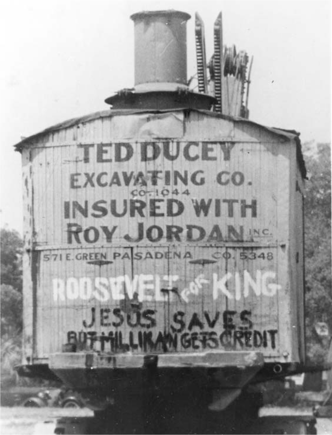 This graffiti-covered steam shovel, photographed on the Caltech campus in 1937, suggests that Millikan, although famous, did have his detractors, even at his own school.