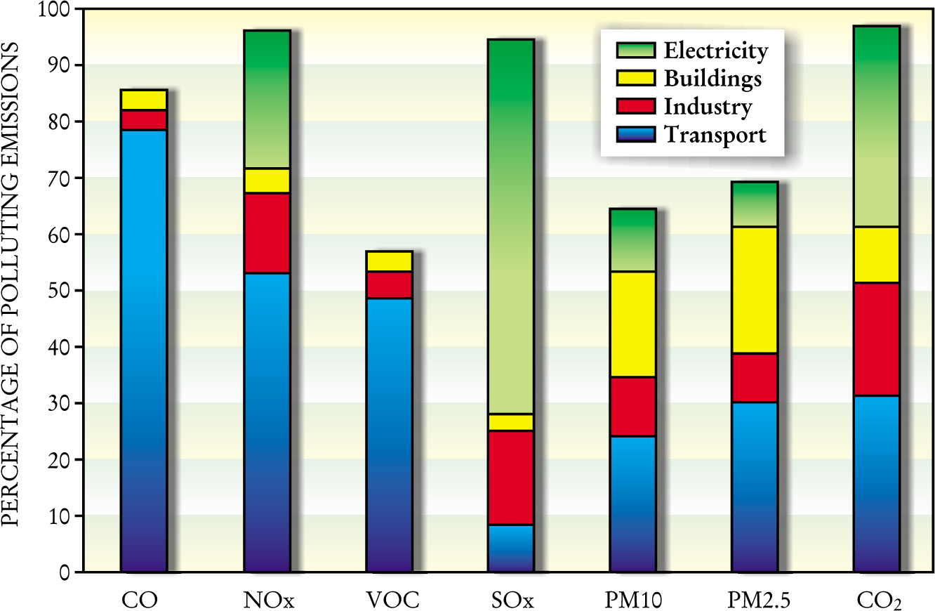 Fraction of atmospheric emissions of pollutants and carbon dioxide in the US in 1998 from sources directly related to energy supply and use, grouped by sectors of the economy. The emissions are: oxides of carbon, nitrogen, and sulfur; volatile organic compounds; and particulates (labeled by typical size in micrometers) from anthropogenic sources other than agriculture, forestry, or unpaved roads.