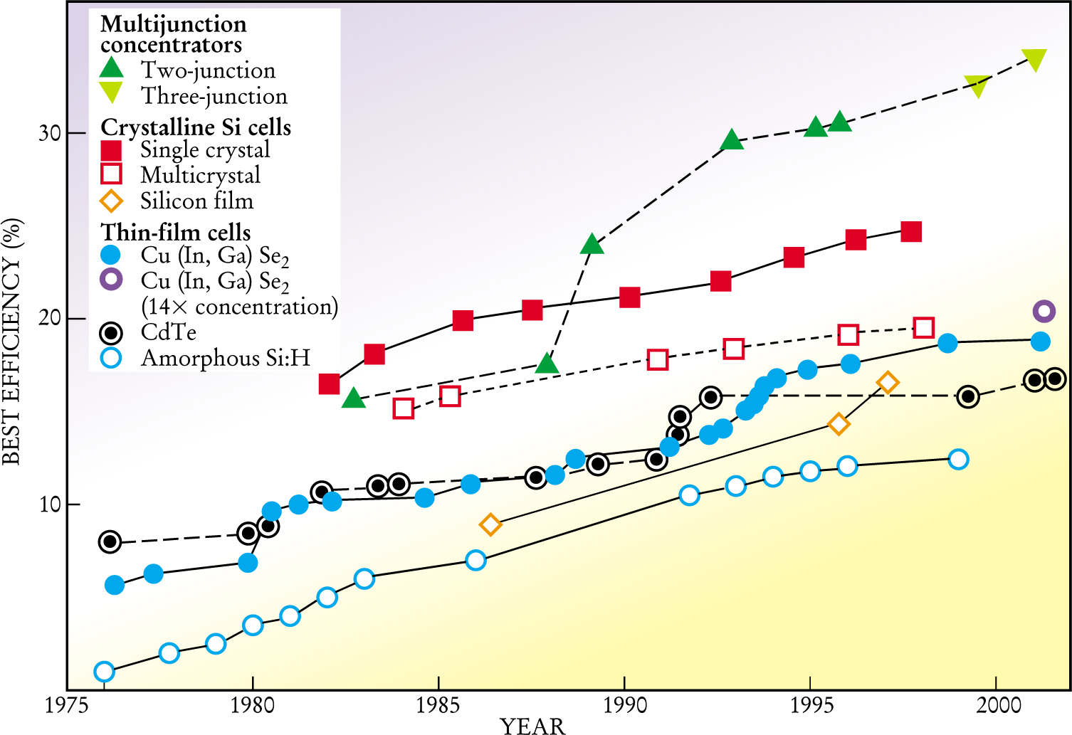 Improving efficiencies of laboratory photovoltaic cells of various kinds in recent decades. Present record holders include Spectrolab (3-junction concentrators), University of New South Wales (single and multicrystal Si), National Renewable Energy Laboratory (CIS and CdTe), Astropower (Si film), and United Solar (amorphous Si).