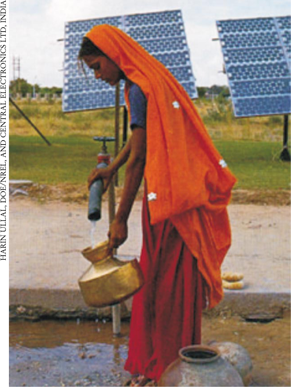 In rural India, many water pumps are already powered by photovoltaics. The solar panels are visible behind the woman collecting potable water.