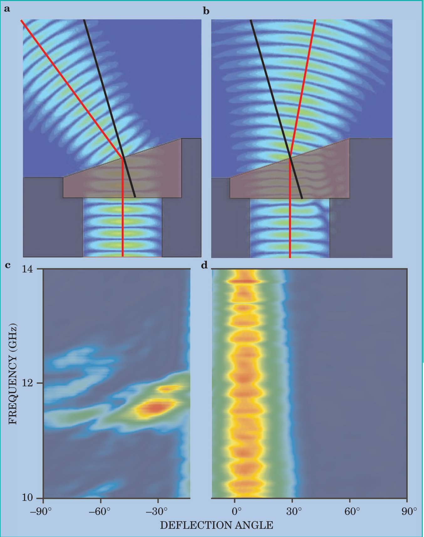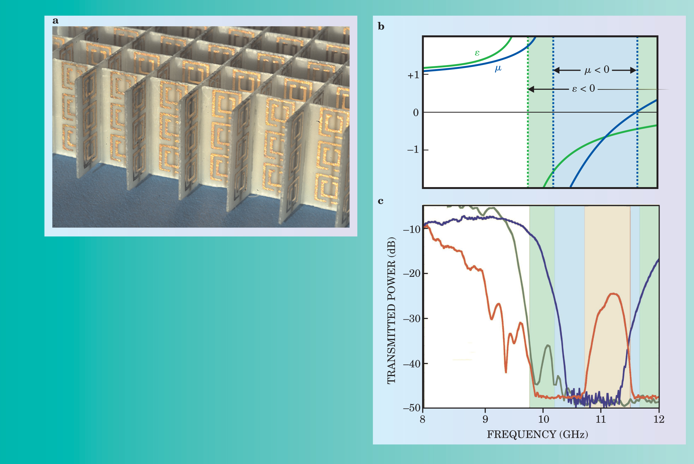 While the UCSD data were compelling, the concept of negative index proved counterintuitive enough that many other researchers needed further convincing. In 2003, Andrew Houck and colleagues at MIT repeated the negative-refraction experiment on the same sort of negative-index metamaterial and confirmed the original findings. 4 Looking at wedges with different angles, the MIT group showed that the observed angle of refraction was consistent with Snell’s law for the metamaterial. In the same year, Claudio Parazzoli and coworkers at Boeing Phantom Works also confirmed the negative-refraction results in a separately designed sample. 5 In their measurements, the detector’s distance from the sample was significantly larger than for previous demonstrations.