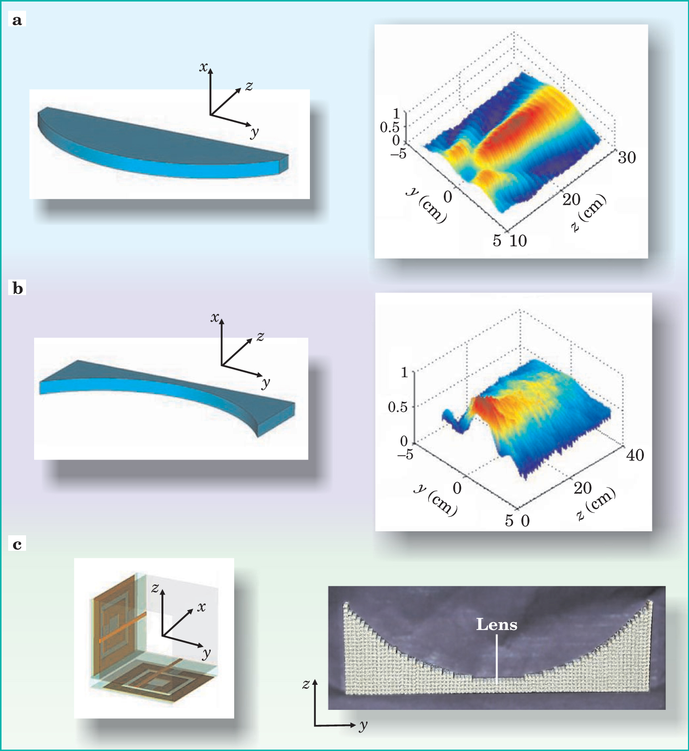 Figure 3. Lightweight, compact lenses can be designed from metamaterials to be relatively free of aberration. (a) A positive-index lens with an index of refraction