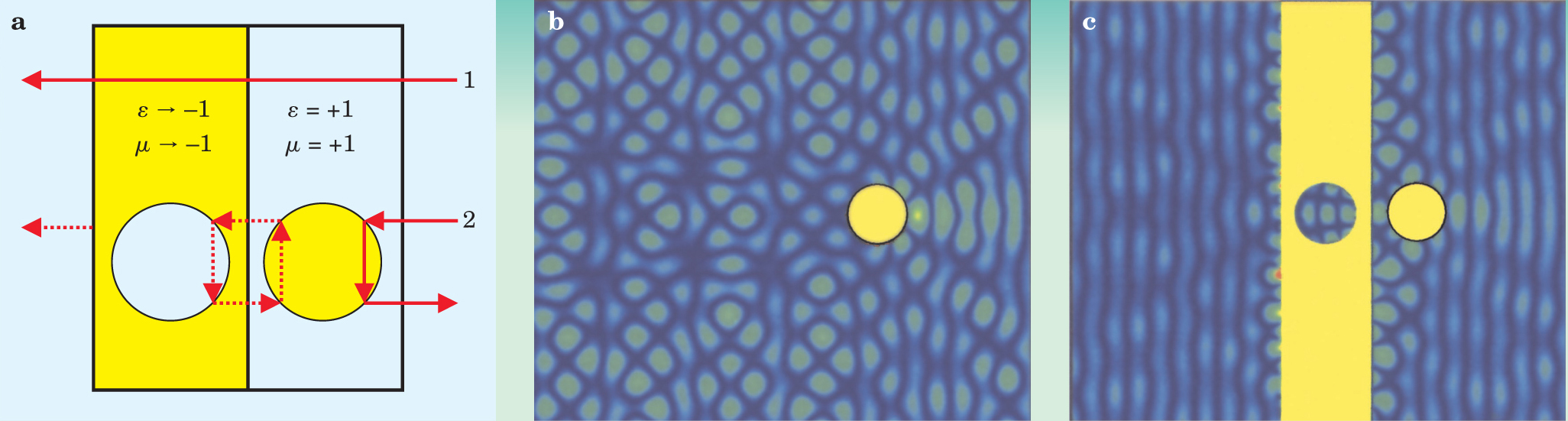 This result may seem straightforward, but some configurations have surprises. The two halves of figure 6(a) are inverse mirror images as required by the cancellation theorem, and therefore we expect that incident waves are transmitted without attenuation and without reflection. Yet a ray-tracing exercise holds a surprise. Ray 2 in the figure hits the negative cylinder and is twice refracted to be ejected from the system rather than transmitted. The rays don’t support our theorem!