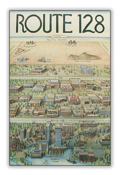 Route 128, near Boston, passes through a famously dense concentration of startup companies. (Poster by Kirby Scudder, 1987; used by permission.)