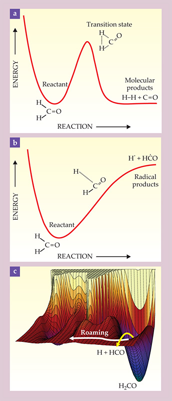 Figure 1. Two reaction pathways and hints of a third. (a) In conventional dissociation to molecular products, the system must surmount a potential-energy barrier as old bonds are broken and new ones are formed. (b) In dissociation to radical products, one bond stretches until it breaks, and no new bonds are formed. The energy required for the reaction is the energy needed to break the bond, with no additional barrier. (c) A roaming reaction begins like a dissociation to radical products, with the stretching of one bond. But then the trajectory veers away to explore new regions of the potential energy surface. The PES for formaldehyde (H2CO), or any other nonlinear four-atom system, is a six-dimensional hypersurface. A 3D perspective plot is shown here.