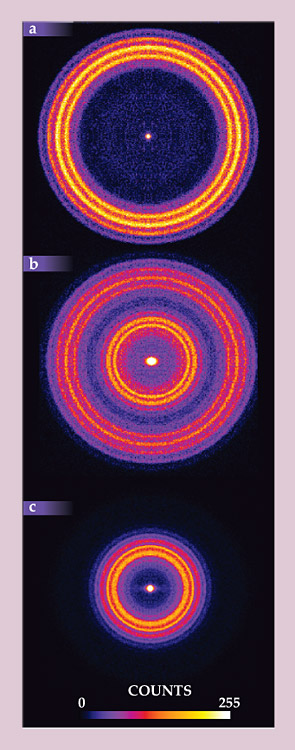 Figure 2. Velocity-map images of CO created when formaldehyde dissociates into H2 + CO. The three panels show three different CO quantum states, with (a) 40 quanta, (b) 28 quanta, and (c) 15 quanta of rotational excitation. Large rings represent fast-moving products, and small rings represent slow-moving products. The slow products in panels b and c cannot be explained by conventional transition state theory; some other mechanism must be in play. (Adapted from ref.
