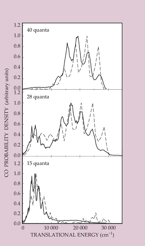 A new level of insight into the H2CO results came from a novel experimental technique called high-resolution state-selected ion imaging, 10 with the latest improvements: velocity mapping and DC slice imaging. In those experiments, one spectroscopically selects a particular CO rotational and vibrational state and collects a 2D image of all the fragments in that state. The image is a map of the CO molecules’ velocities: The slowest fragments show up nearest the center, and the fastest ones appear farthest away. Momentum and energy conservation then dictate the corresponding H2 internal-state distribution: The CO momentum uniquely determines the H2 momentum, and whatever energy is left over must be H2 internal (vibrational and rotational) energy. An advantage in the H2CO system is that the quantum states of H2 are widely spaced, making it easier to assign particular CO signals to the states of the H2 partner fragments.