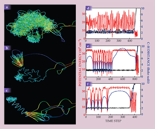 A different way of visualizing the trajectories, developed by Frank Suits at the IBM Thomas J. Watson Research Center, is shown in figure 5. Figures 5a, 5b, and 5c show the paths of the two H atoms over several hundred time steps prior to dissociation, and figures 5d, 5e, and 5f show the potential energy and the two C–H distances for the same trajectories over the same period. Figure 5a is a conventional trajectory leading to vibrationally cold H2, and figures 5b and 5c are roaming trajectories.
