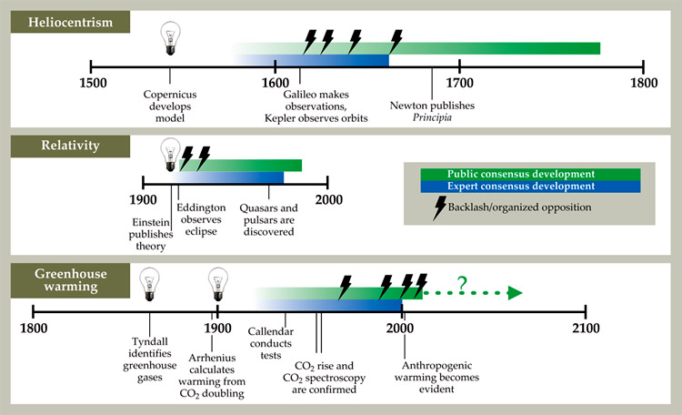 Figure 4. Timelines for heliocentricism, relativity, and greenhouse warming, aligned by their dates of introduction. Colored bars indicate the estimated times to consensus among experts and the public. Lightning symbols denote organized opposition from contrarian, religious, or political groups. The sequence of events is similar in all three cases except that relativity attained consensus more rapidly, especially among the public; it had emerged essentially fully formed, whereas the other two underwent refinements for many decades.