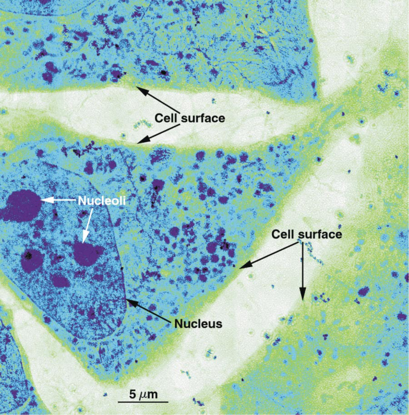 In figure 1, numerous organelles, granules of various sizes, and tubular structures such as mitochondria can be readily seen in the cytoplasm. Even the contents of the nucleus, which is approximately 5 µm thick in these cells, can be observed without the need for physically sectioning the cell. Nuclear structures such as the nucleoli, which are densely packed with ribonucleic acid, appear as dense bodies, and the nuclear envelope, a double-layered membrane encircling the entire nucleus, appears as a distinct line around the nucleus. The striking contrast of the cellular ultrastructure is solely the result of the use of the water window; these cells had not been exposed to any chemical fixatives or contrast enhancement agents. Because of the high differential contrast provided by x-ray imaging, the location of specific proteins and nucleic acids can be readily identified by using gold-tagged labels that are easily distinguished from biological constituents.