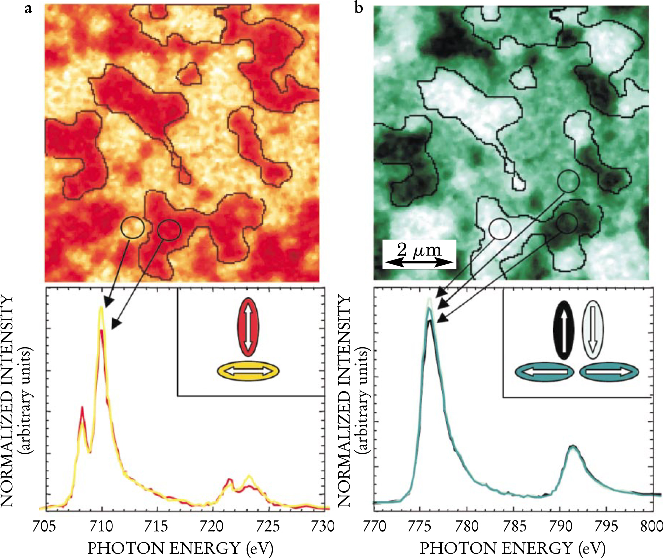 Figure 2. Images and local spectra from a ferromagnetic cobalt layer on an antiferromagnetic LaFeO3 substrate. (a) Antiferromagnetic contrast is obtained at the iron L-edge using linear dichroism, which uses the difference in absorption of linearly polarized x rays when the electric vector of the light is parallel or perpendicular to the antiferromagnetic axis. (b) Ferromagnetic contrast is obtained at the Co L-edge using circular dichroism, which uses the difference in absorption between left and right circularly-polarized x rays. The inset arrows indicate the in-plane orientation of the antiferromagnetic axis and ferromagnetic spins. Note that the ferromagnetic Co domains align with the substrate antiferromagnetic domains, but can split into subdomains of opposite magnetization. Spatial resolution of the images is 20 nm.