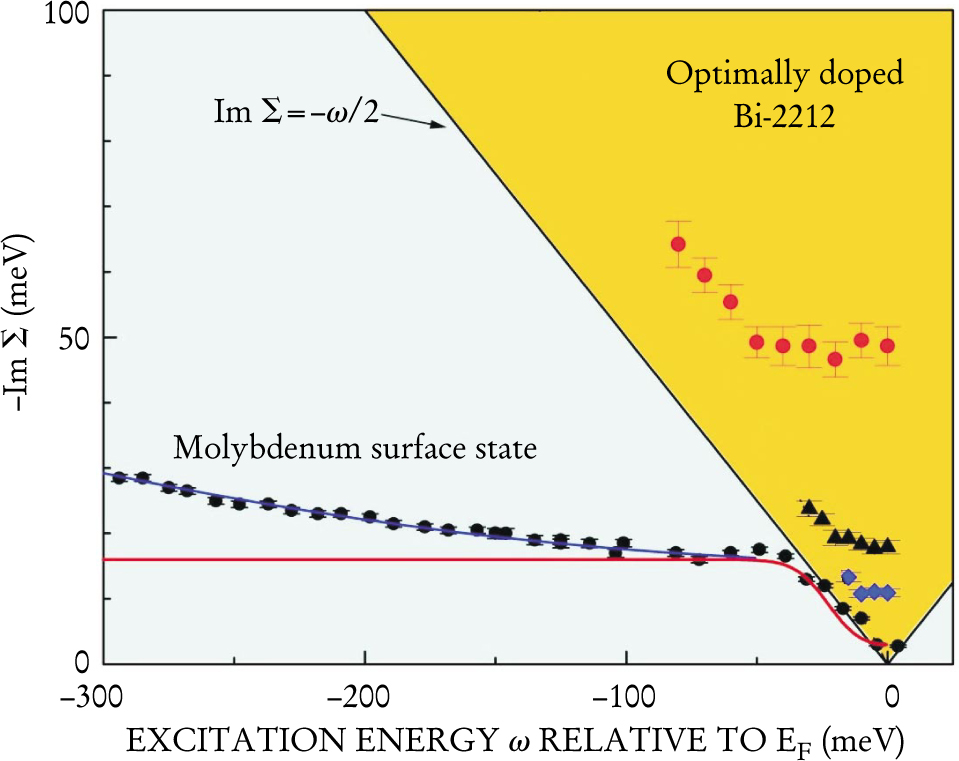 Figure 4. Excitation lifetime widths in two materials near the Fermi level, as measured by angle-resolved photoemission spectroscopy (ARPES). The lifetime of an electronic excited state is inversely proportional to the magnitude of the imaginary part of the single-particle self energy |Im Σ|, which is observed with ARPES by measuring the width of the photoemission peak; the lifetime width is −2 Im Σ. A molybdenum surface state, Mo(110), was used as a test-bed to establish the validity of the method; the results (black circles) are well matched by theory (blue curve). The blue curve is the sum of contributions from the electron–phonon interaction (red curve) and from Fermi-liquid theory (a parabola, not shown). In contrast, measurements of the superconducting material Bi-2212 suggest that the system exhibits quantum critical behavior. Lifetime widths for Bi-2212 are shown for three temperatures: 300 K (red circles), 90 K (black triangles), and 48 K (blue diamonds). The widths lie in a region (shaded orange), where Fermi liquid theory does not apply.