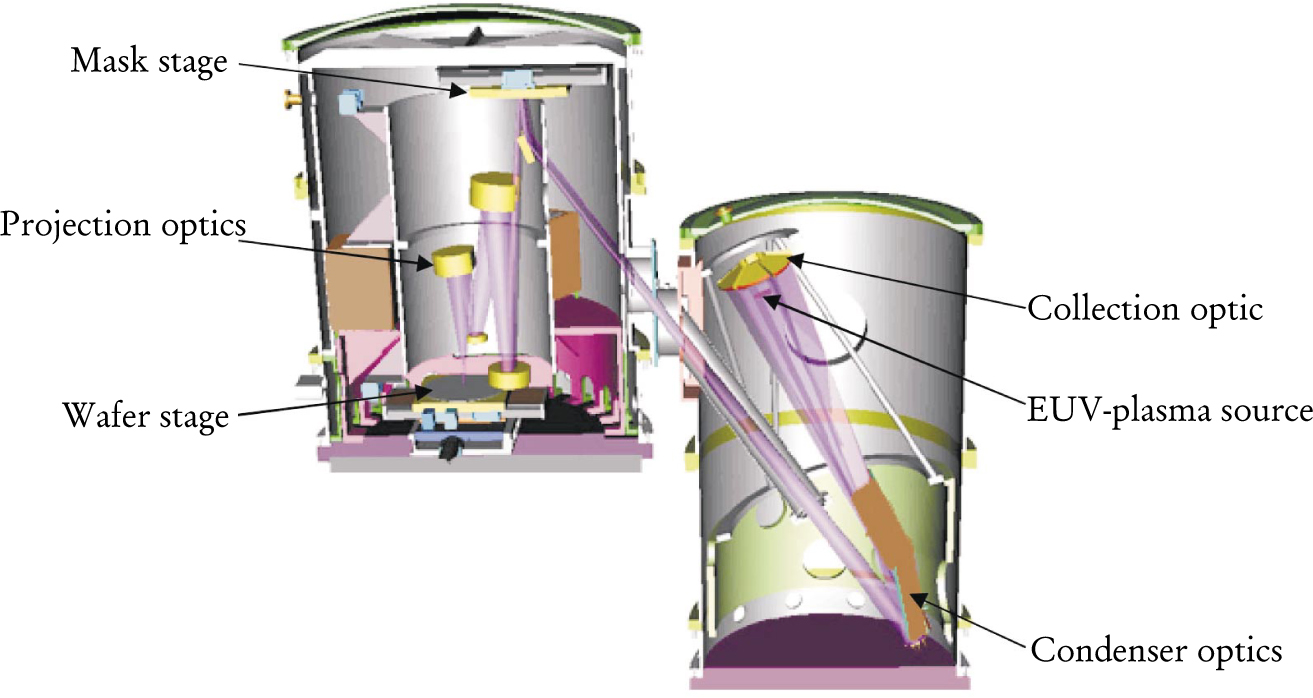 Following Moore’s Law, the density of circuit elements on microchips has doubled roughly every 18 months, resulting in smaller, faster, and cheaper computers. However, optical lithography, the present technology of microchip manufacture, cannot continue indefinitely on this course. The materials from which one could conceivably make optical lenses, CaF2, MgF2, and LiF, will not transmit light at wavelengths less than 100 nm, which limits the size of features that could be fabricated in this way. One alternative being considered is to switch from refractive optics to reflective optics—that is, mirrors. The availability of molybdenum–silicon mirror coatings that have reflectances as high as 70% provides special impetus for reflective technology. The optimum wavelength, determined as a compromise between the conflicting requirements of fine lateral spatial resolution and large depth of focus into the chip structure, is about 13 nm. This wavelength is popularly referred to as extreme ultraviolet (EUV); the corresponding photon energy is 100 eV, which qualifies it as a soft x ray.