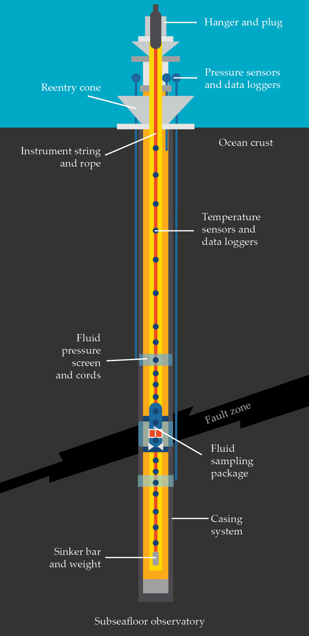 The ability to install observatories deep beneath the seafloor to acquire data and monitor subseafloor systems in situ is one of the most exciting and unique aspects of modern scientific ocean drilling (see figure