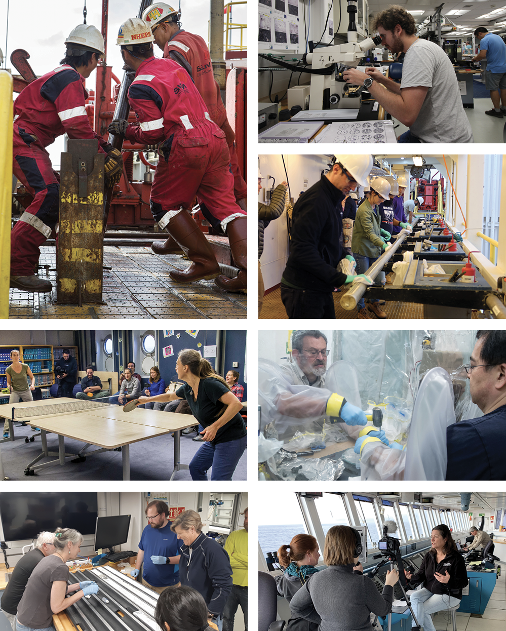A day in the life on the JOIDES Resolution. At any given moment, scientists, technicians, and crew members may be working, eating, sleeping, or relaxing on the ship, which operates 24/7. (Courtesy of the International Ocean Discovery Program and the JOIDES Resolution Science Operator. Photographers are Tim Fulton, top left, middle left, and second from bottom right; Rosie Sheward, bottom left; Takuya Sagawa, top right; Yiming Yu, second from top right; and Trevor Williams, bottom right.)