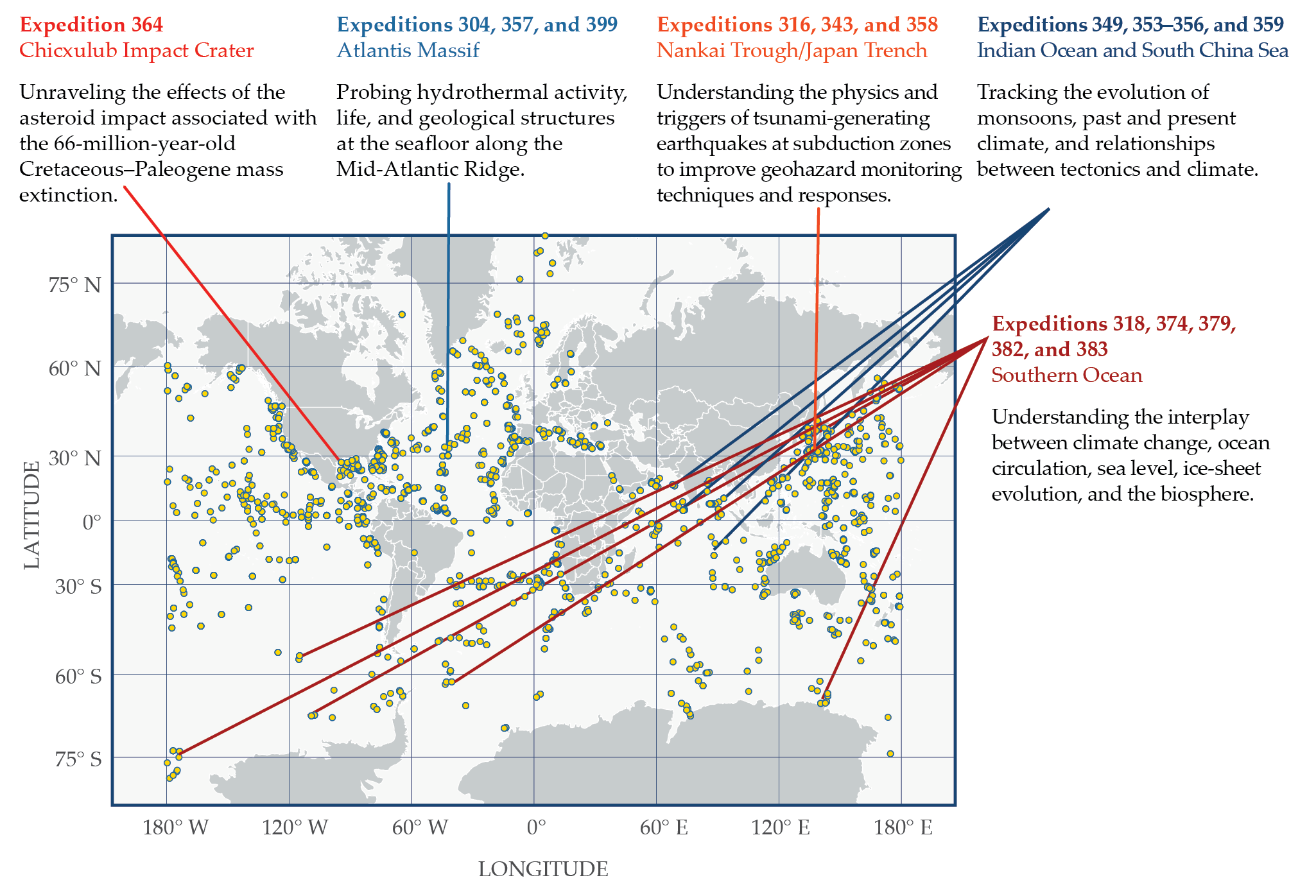 Scientific ocean drilling sites sampled across the globe between 1968 and 2022. Several recent International Ocean Drilling Program expeditions are highlighted. (Data from https://iodp.org/resources/maps-and-kml-tools