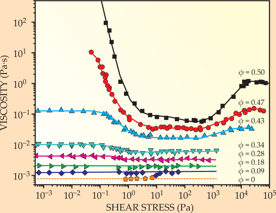Figure 1. The viscosity of colloidal latex dispersions, as a function of applied shear stress. The volume fraction φ of latex particles in each dispersion distinguishes the curves. A critical yield stress must be applied to induce flow in a dispersion with high particle concentration. Beyond that critical stress, the fluid’s viscosity decreases (shear thinning). At yet higher stress, its viscosity increases (shear thickening), at least for latex dispersions above some concentration threshold.