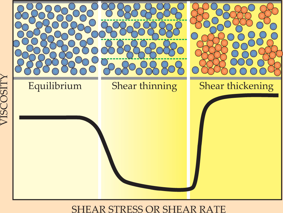 When the range of the repulsive force approaches 10% of the particle radius, the shear thickening is effectively eliminated and the suspension flows with low viscosity. Manipulating those nanoscale forces, the particles’ composition and shape, and properties of the suspending fluid so as to control the sheer thickening, however, remains a challenge for the suspension formulator.