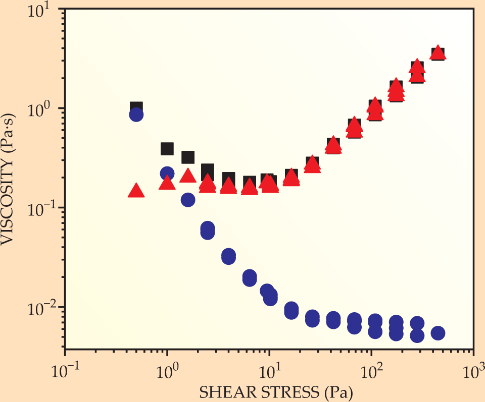 Referring back to figure 1, one can see that a colloidal volume fraction φ = 0.50 produces a latex dispersion whose viscosity is 1 Pa·s at a low shear stress and again at one more than four orders of magnitude higher. The same viscosity emerges for very different reasons, though. Changes in the particles’ size, shape, surface chemistry, and ionic strength and in properties of the suspending medium all affect the interparticle forces, which dominate the viscosity at low shear stress. Hydrodynamic forces, in contrast, dominate at high shear stress. Understanding the difference is critical to formulating a dispersion that behaves as needed for specific processes or applications.