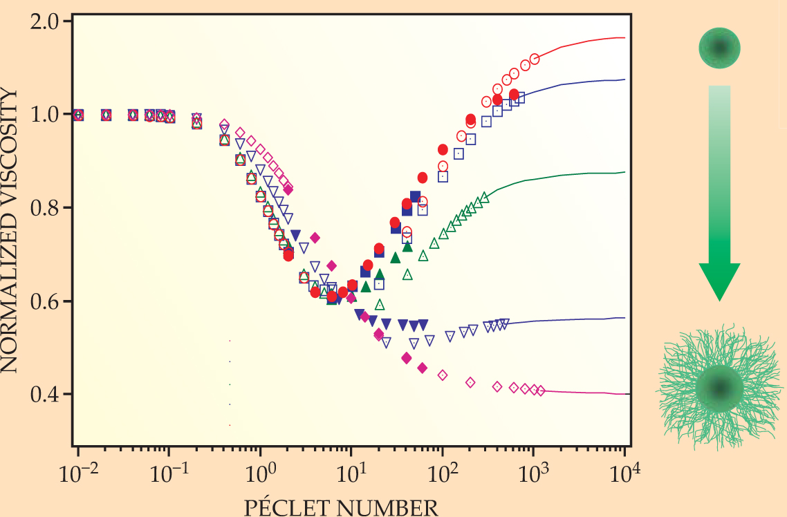 Figure 4. Shear thickening can be suppressed by reducing the interactions between particles, as shown here based on numerical calculations. The extent of the reduction affects whether an increasing Péclet number (a measure of shear rate) leads to a shear-thickening state or a shear-thinning one. The effect is evident experimentally when a polymer layer, or brush, is grated onto the particles: The dispersion becomes progressively less viscous as the brush thickness on each particle increases.