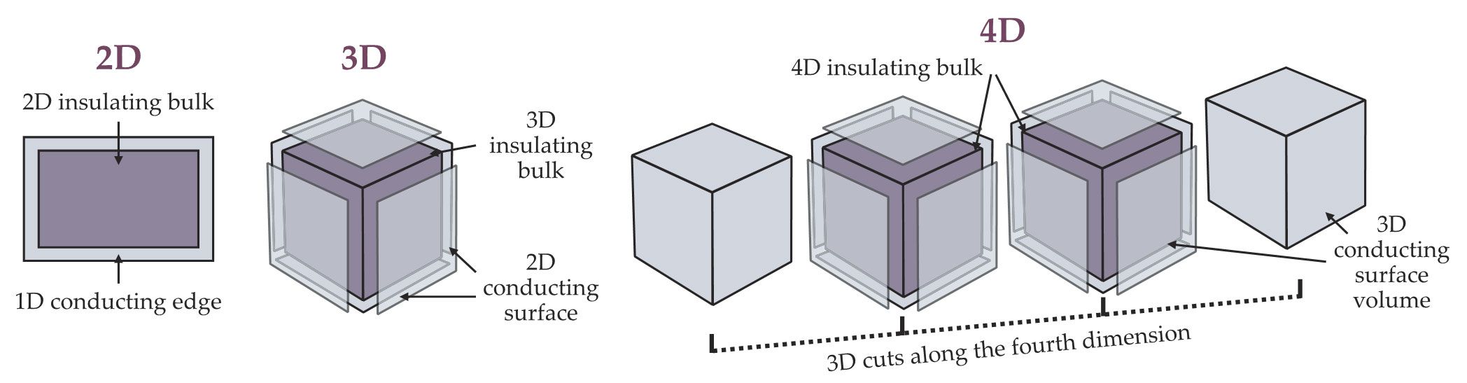 Spatial dimensionality changes the nature of topological insulators and their edge currents. As depicted in figure 1, a 2D topological insulator has effectively 1D conducting edge channels, whereas a 3D topological insulator is covered with 2D conducting surfaces. Similarly, a 4D topological insulator should be an unusual material with robust 3D conducting surface volumes. What’s more, not only the edge behavior but also the underlying physics and the definitions of topological indices depend on the spatial dimensionality and symmetries of the system.