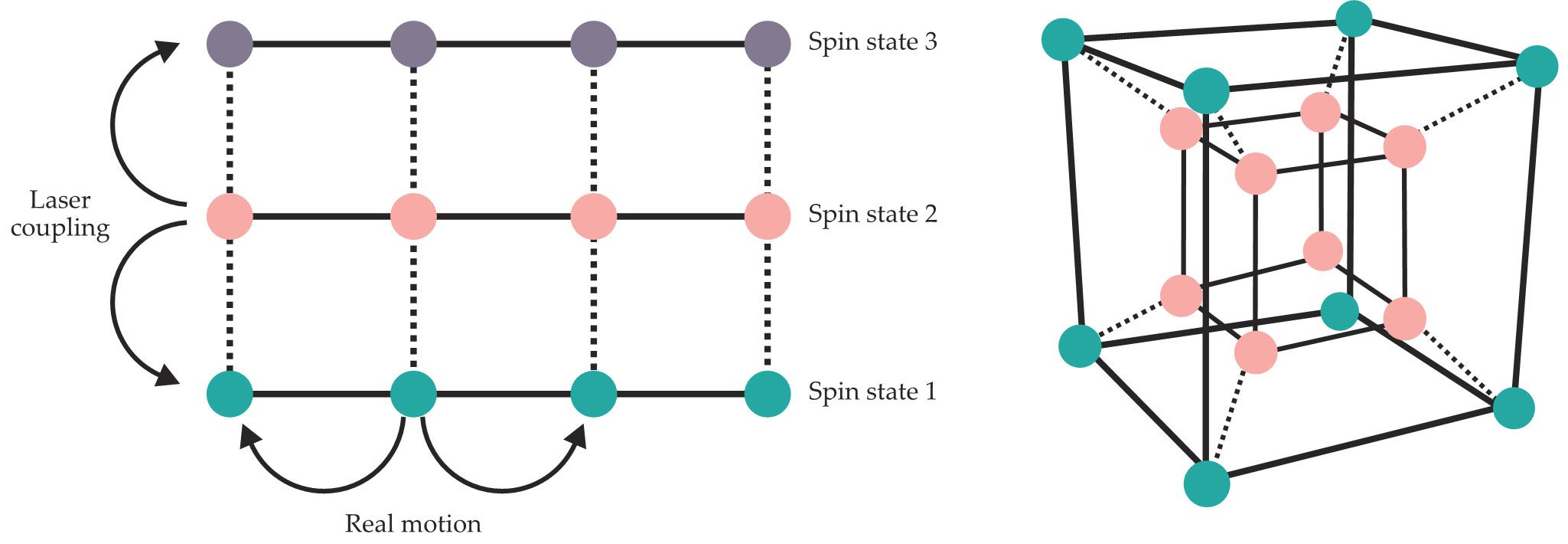 To get a feel for how the trick works, consider the example of a gas of identical atoms trapped in a vacuum chamber and cooled close to absolute zero. Each atom has various possible internal atomic spin states, which correspond to different configurations of its constituent electrons and nucleus. Shining suitable lasers onto an atom can stimulate a sequential transition between those internal states, as sketched in figure 3. As those transitions happen, the atom’s spin-state label changes step-by-step, similar to how a discrete spatial coordinate changes when particles hop between lattice sites. That analogy is powerful and effective, and it reframes different spin states as spanning a synthetic dimension.