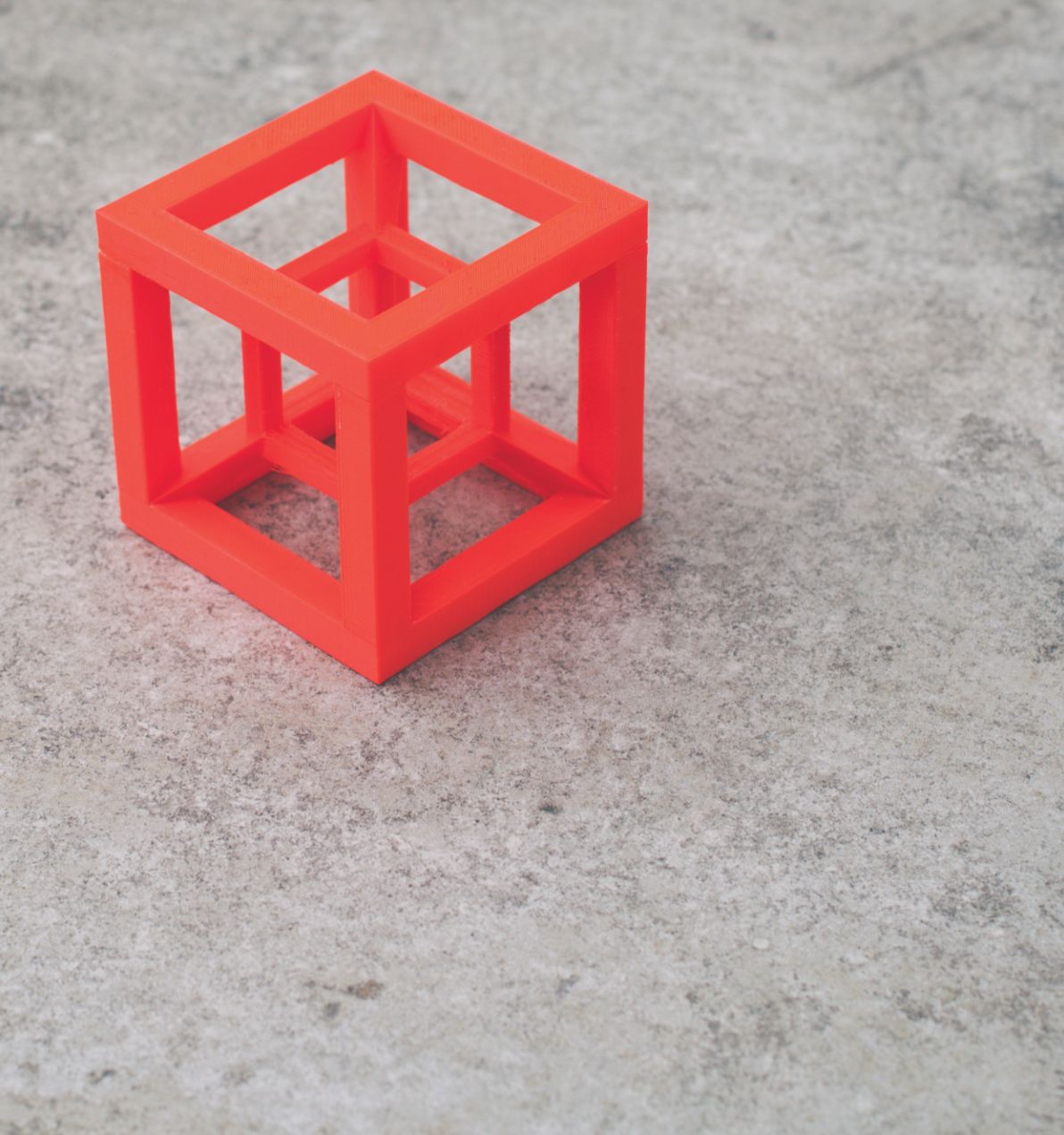 Synthetic dimensions turn atomic spin states—or other internal states or intrinsic properties—into something similar to a spatial dimension. A two-dimensional discrete lattice model (left) comprises one real spatial dimension and one synthetic dimension composed of atomic spin states. Hopping along the real dimension (solid lines) corresponds to real atomic motion, whereas hopping along the synthetic dimension (dashed lines) corresponds to laser-induced transitions between spin states. The unit cell of a 4D hypercubic lattice (right) is a tesseract. Such shapes can be crafted with a suitable combination of real and synthetic spatial dimensions.