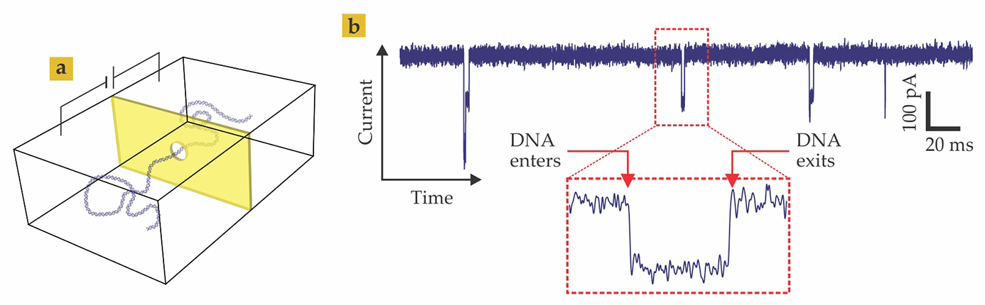 Figure 1. Threading DNA through a nanopore. (a) A negatively charged DNA molecule immersed in electrolyte solution can be coaxed through a nanopore by an electric field. (b) Experimental current trace of DNA molecules stochastically captured into a pore. The transiting molecule momentarily blocks the flow of ionic current through the pore by an amount that depends on the volume of the molecule within the pore constriction.