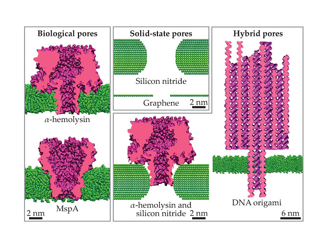 Nanopores can be broadly classified into three categories: biological, solid state, and hybrid, as shown in figure 2. Biological pores, studied for several decades now, typically consist of transmembrane proteins harvested from living cells. Since the initial experiments with α-hemolysin, biochemists have explored a range of biological pores, including the protein MspA, produced by Mycobacteria; ClyA, produced by Escherichia coli; and the anthrax toxin.