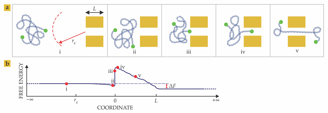 Figure 3. The threading of a biopolymer strand through a nanopore of length L proceeds through the stages shown in (a): (i) The charged polymer drifts into the capture zone, defined by the radius rc, and is pulled toward the pore by an applied electric field; (ii) the biopolymer arrives at the pore with its ends unregistered with the pore entrance; (iii) one end of the strand aligns with the pore entrance and enters the pore; (iv) the strand begins to uncoil as the end moves through the pore; and (v) the strand crosses the pore through a combination of electrophoretic drift and diffusion. Each step corresponds to a different stage on a free-energy landscape (b). The coordinate values 0 and L correspond to the points when the chain’s head and tail enter and exit the pore, respectively. The transitions between the various stages are typically associated with a free-energy barrier of 10–15 kBT. Here, ΔF is the net free energy gain by the translocating molecule.
