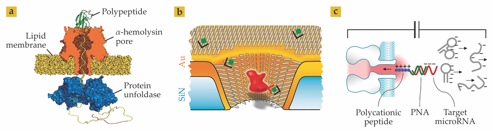 Figure 4. Nanopore biosensors take a variety of forms. (a) A protein-unfolding enzyme, ClpX , can be used to pull a polypeptide chain linearly through an α-hemolysin pore. The technique suggests the possibility of using nanopores to perform protein sequencing. (Adapted from ref.