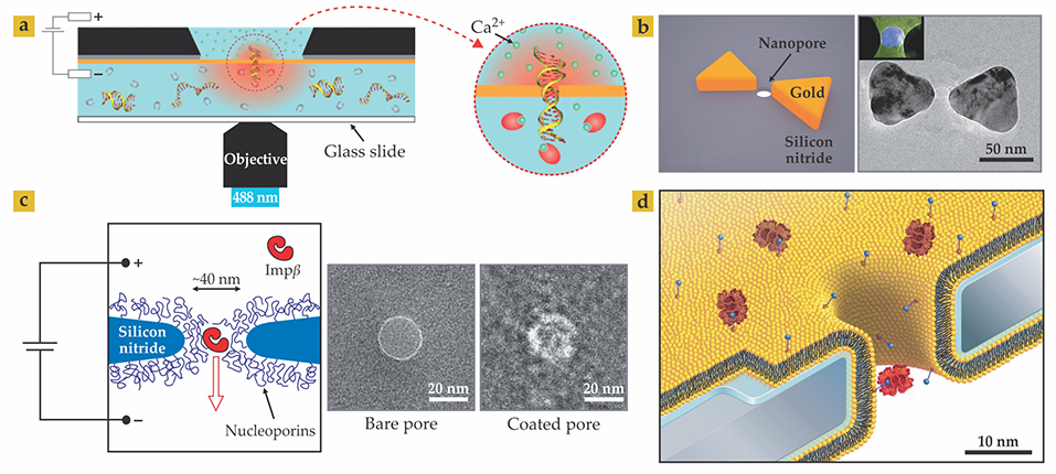 Although ionic current remains the most popular detection modality in nanopore experiments, new modalities are being explored. They include optical methods involving the detection of fluorescent dyes attached to analytes or, as illustrated in figure 5a, the use of ion-sensitive dye gradients across the pore. 13 Plasmonic nanostructures can be integrated into the membrane to focus light onto the nanopore, as shown in figure 5b, and may allow Raman spectroscopy of translocating analytes. 14 Researchers are also pursuing alternative electrical methods of detection, including measuring the tunneling current between nanoelectrodes positioned opposite one another across the pore’s diameter and, in graphene, measuring the electrical current in the membrane plane. Nanopores can also be combined with other single-molecule measurement techniques, such as optical tweezers, to measure the force on a macromolecule within the pore, which greatly enhances their capabilities for biophysics experiments.