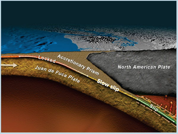 Figure 1. Slow slip appears most prominently in subduction zones, on the plate boundary between the shallow, locked section and the deeper, freely slipping section. The illustration shows an east–west cross section beneath Seattle, Washington, and Vancouver, British Columbia, Canada, in the Cascadia subduction zone. The Juan de Fuca Plate is pushed under the North American Plate as the two plates move together. Marine sediments scraped off the subducting plate build up in the accretionary prism.