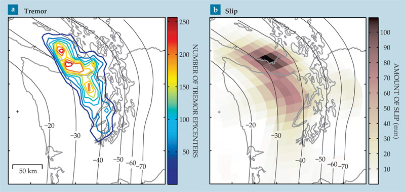 Figure 2. Tremor and slip are usually observed on the same patch of fault during a slow-slip episode. (a) Tremor, observed by seismometers and quantified as the number of tremor epicenters per 0.1° × 0.1° bin, summed over four slow-slip episodes in the Cascadia subduction zone from 2004 to 2008. (b) Total slip, measured by GPS, for the same four episodes. The contours in both panels show the depth of the plate interface. (Adapted from ref.