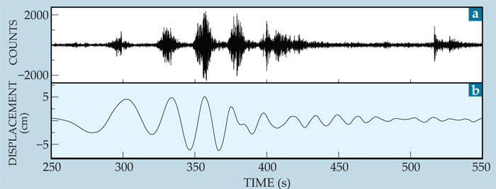 Figure 3. Seismic waves from distant earthquakes can trigger slow slip. (a) High-frequency tremor under Vancouver Island in southwestern Canada in the wake of the 2002 Denali earthquake in Alaska. (b) Low-frequency seismic record showing the surface waves that triggered the tremor. (Adapted from ref.