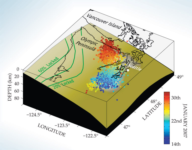 Figure 4. Evolution of a single slow-slip episode in the Cascadia subduction zone. The episode started with the deep blue dots near the southern end, spread bilaterally for a few days, and continued to the north for the rest of the 2 weeks shown. (Courtesy of Aaron Wech.)