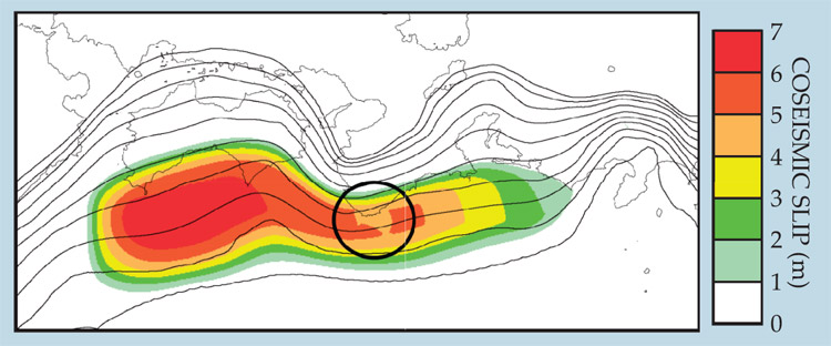 Figure 5. Numerical simulation of possible slow-slip nucleation in Japan’s Tokai region, southwest of Tokyo. Slow slip in the area marked by the circle grows into meters of coseismic slip—that is, a large earthquake. The cabled 25-element DONET array is now installed in the region to monitor deformation in real time.