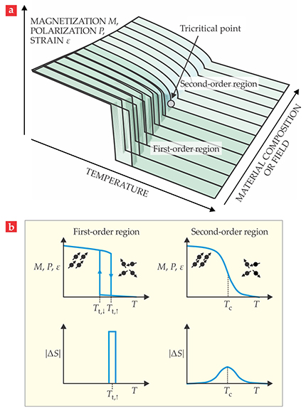 Figure 2. Schematic of a ferroic coolant’s behavior with phase transition as a function of temperature. (a) The change from first- to second-order behavior, through a tricritical point, may be induced by a change of composition or applied field. (b) A first-order transition (left panels) results in a larger transition entropy change ΔS than in the second-order case (right panels), albeit over a narrower temperature window. Tt,↓ and Tt,↑ are transition temperatures for decreasing and increasing T respectively. Thermal hysteresis is clearly present in the first-order case.