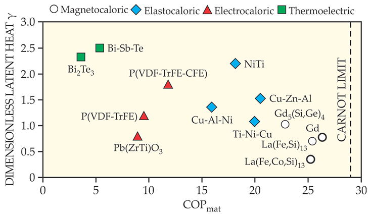 Among the three classes of caloric materials discussed here, magnetocaloric materials have the largest COPmat, a result of the large entropy change that is attainable by a magnetic field. But their γ values are among the lowest, indicating that they need the elaborate regenerator schemes mentioned above. The COPmat for elastocaloric materials is generally not as high as the values for magnetocaloric materials, but they have the largest γ values thanks to their low specific heats. Of the three, electrocaloric materials have the lowest recorded COPmat, which reflects the modest latent heat values associated with their first-order transition. Electrocalorics can be considered the least developed of the three cooling technologies, and the development of high-performance electrocaloric materials is a relatively new area of research in the age-old field of ferroelectric materials.