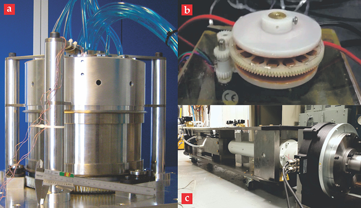 Figure 4. Caloric cooling system prototypes. (a) This 140-W magnetocaloric cooler is 25.5 cm in diameter.
