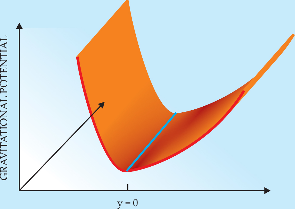 The gravitational theory involves a dynamic spacetime fluctuating around a special curved background: The gravitational potential energy rises sharply as the coordinate y of the extra dimension approaches infinity. To motivate the correspondence, we consider a class of curved spacetimes for which the gravitational potential energy has an absolute minimum at y = 0, as in figure 1. The correspondence asserts that the dynamics of the d + 1–dimensional gravitational theory is encoded in a d-dimensional QFT. That should not be too surprising: In the presence of a potential energy rising sharply along a particular spatial direction, one expects the low-energy dynamics of a theory to become effectively confined to the remaining dimensions. The gauge/string duality, however, goes beyond that simple intuition because even motion along the extra dimension is reproduced by the corresponding d-dimensional QFT.