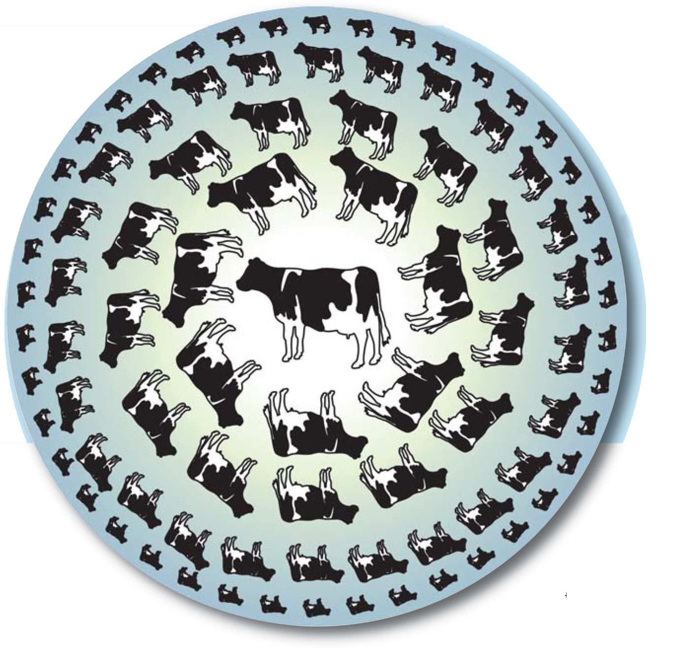 Figure 2. Hyperbolic space. Shown here is a map of the simplest negatively curved space. Each of the images has the same coordinate-invariant “proper” size; they appear to get smaller near the boundary because of their projection onto the flat surface of this page. A related phenomenon happens in standard Mercator-projection maps of Earth: Objects of a fixed proper size appear broader at high latitudes. The map of hyperbolic space is reminiscent of M. C. Escher’s Circle Limit woodcuts, but we have replaced Escher’s interlocking fish with cows to remind readers of the physics joke about the spherical cow as an idealization of a real one. In the anti–de Sitter/conformal field theory correspondence, theorists have really found a hyperbolic cow.