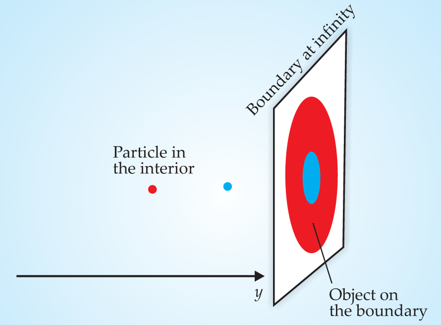 Figure 3. The extra dimension in the dual gravitational description of a conformal field theory. An object in a CFT may be pictured as being confined to the boundary of a higher-dimensional gravity theory. The blue and red disks depict two objects in the CFT that differ by only a scale transformation—that is, a uniform multiplication of all the coordinates. In the gravity theory, the two objects are described by the same particle at two different positions in the extra dimension with coordinate y. The red dot, corresponding to the bigger object on the boundary, is located at smaller y.