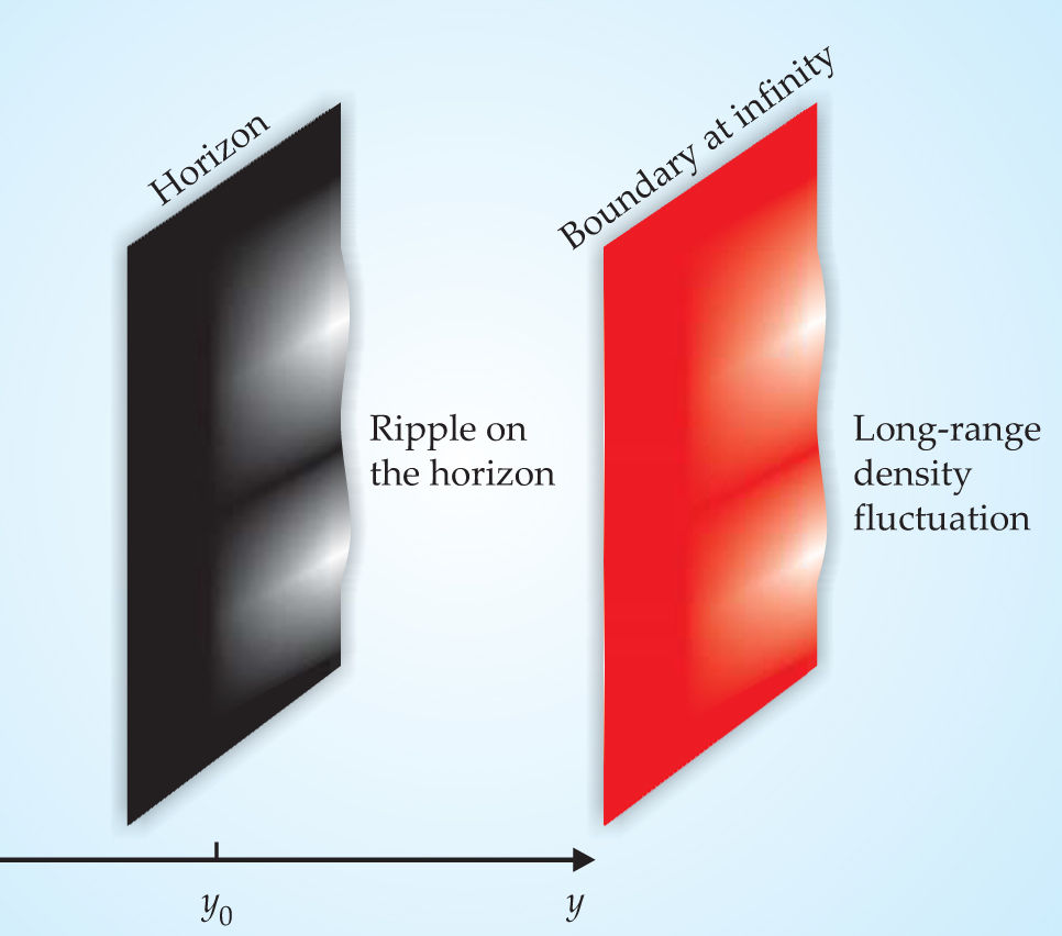 Figure 4. The black hole duality. A strongly interacting quantum field theory at a finite temperature is related to a black membrane—the higher-dimensional analogue of a black hole—in the dual gravity system. Thermodynamic properties of the strongly coupled QFT are related to geometric properties of the horizon. For example, a long-range fluctuation in the density of the thermal system corresponds to a ripple on the event horizon surrounding the black membrane. This ripple is absorbed by the black membrane; the corresponding phenomenon in the thermal QFT is thermalization.